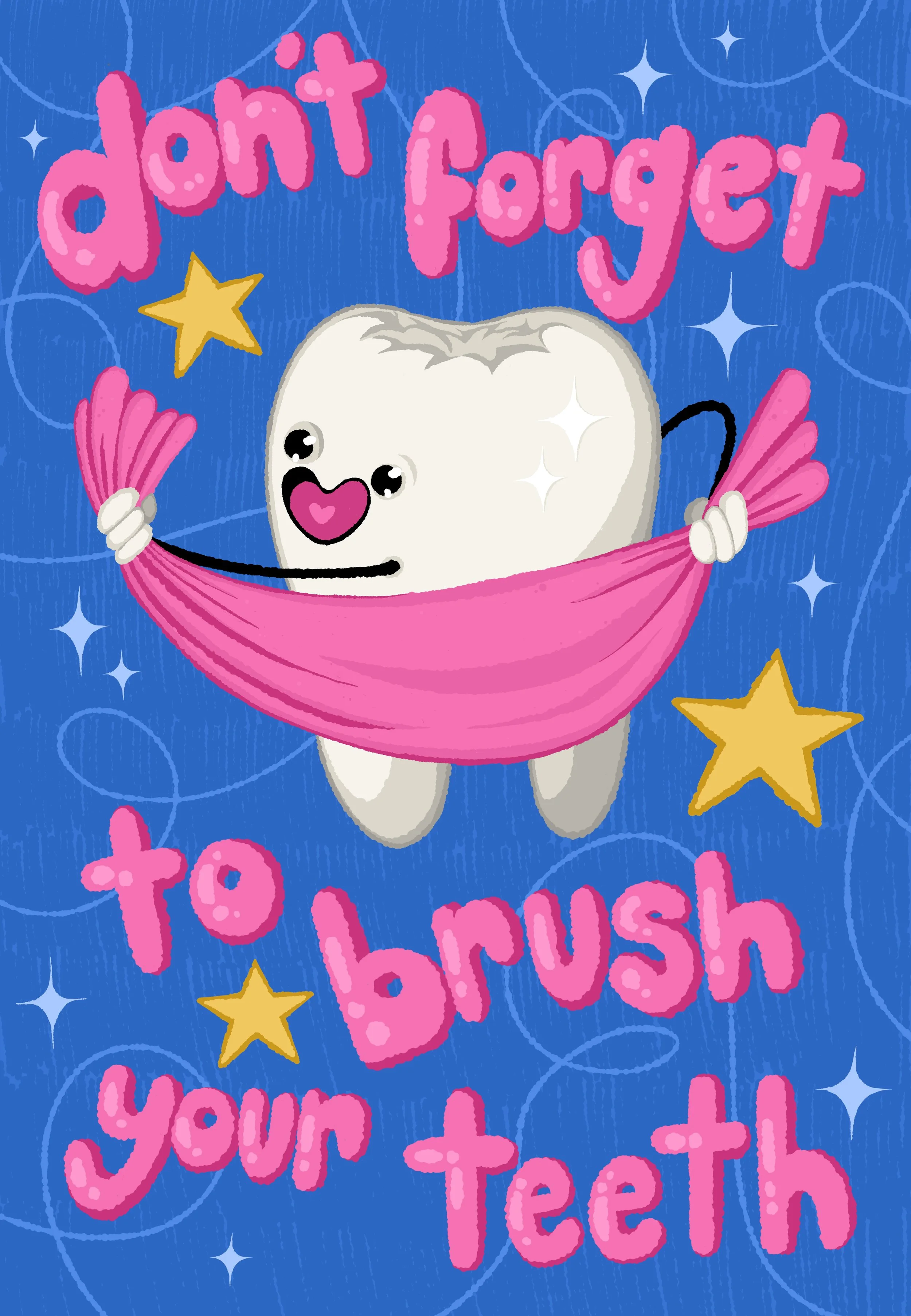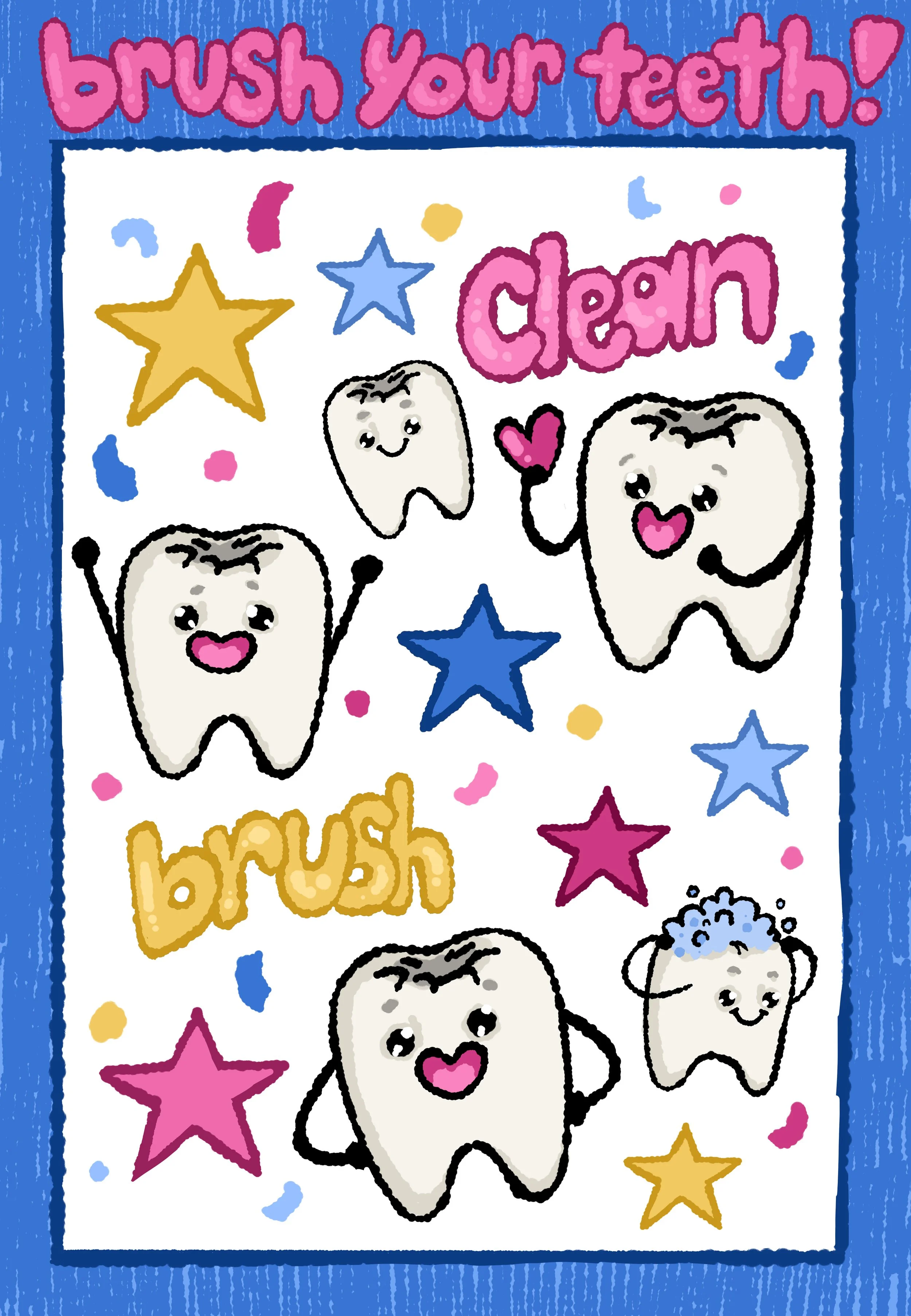 Don’t forget to brush your teeth! is a silly children’s poster created to inspire children to keep their teeth clean and to brighten up drab dental spaces. To go along with the poster is a matching sticker sheet.
